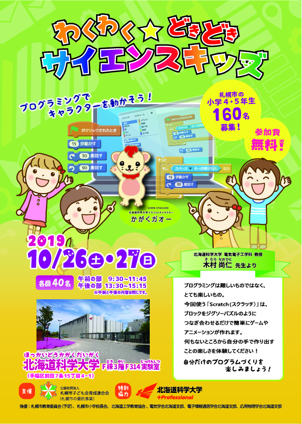 10月26日(土)・27日(日),本学(F314実験室)を会場として,札幌市子ども会育成連合会の主催,当・木村(尚)研究室を実施担当とする小学生対象のScratchプログラミング講座「わくわく・どきどきサイエンスキッズ」を実施します。